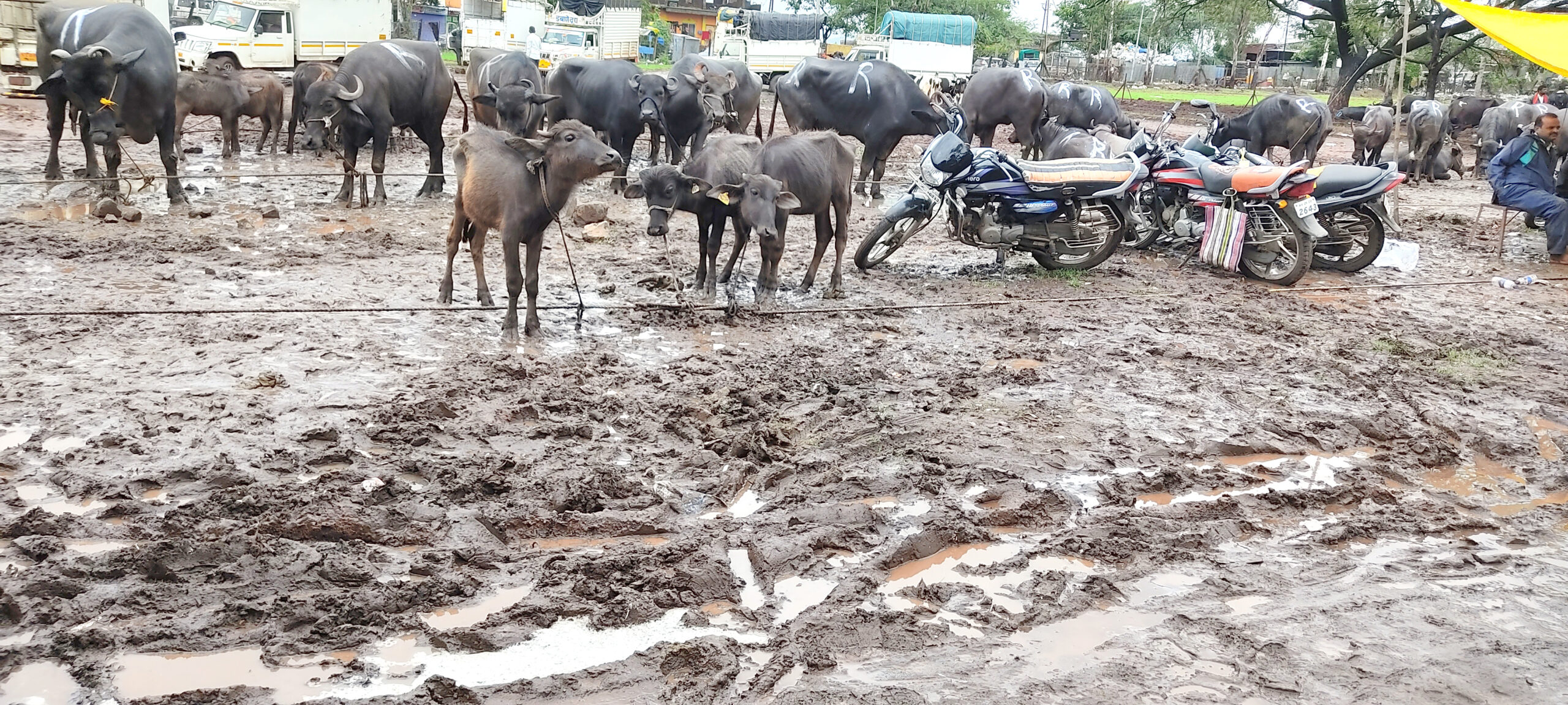 या सर्वांची पाणी, स्वच्छतागृह याची सुविधा उपलब्ध करुन देण्याची बाजारसमितीची जबाबदारी. परंतू, या सर्व सुविधांचा याठिकाणी अभाव दिसतो. सोमवारी बाजारादिवशी पाऊस पडल्यामुळे आवारात प्रचंड चिखल झाला होता. गुडघाभर चिखलात जनावरे उभा करुन व्यापार करण्याची वेळ शेतकऱ्यांवर आली होती. रस्त्यावर सुध्दा चिखल साचल्यामुळे वाहनधारकांनाही जनावरे भरून घेवून जाण्यासाठी कसरत करावी लागली. ठिकठिकाणी शेणाचे ढिग साचले होते. प्रवेशद्वारापासूनच उग्र दुर्गंधी आणि चिखलातून वाट काढत कसरत करताना पहायला मिळाली. तर बाजाराच्या दक्षिण बाजूस झाडे-झुडपे वाढलेली आहेत. त्याची साफसफाई केलेली नाही. तर मुख्य इमारतीच्या पाठीमागे पुर्वेकडील बाजूस कचऱ्याचा खच पडलेला आहे. अनेक नागरि सुविधा याठिकाणी नाहीत. त्यामुळे याबाबत शेतकऱ्यांतून तीव्र संताप व्यक्त होत होता. सध्या पावसाळा सुरू आहे. किमान सखल भागात मुरूमीकरण करुन तात्पुरती का होईना गैरसोय दूर करावी, अशी मागणी यानिमित्ताने होत आहे.