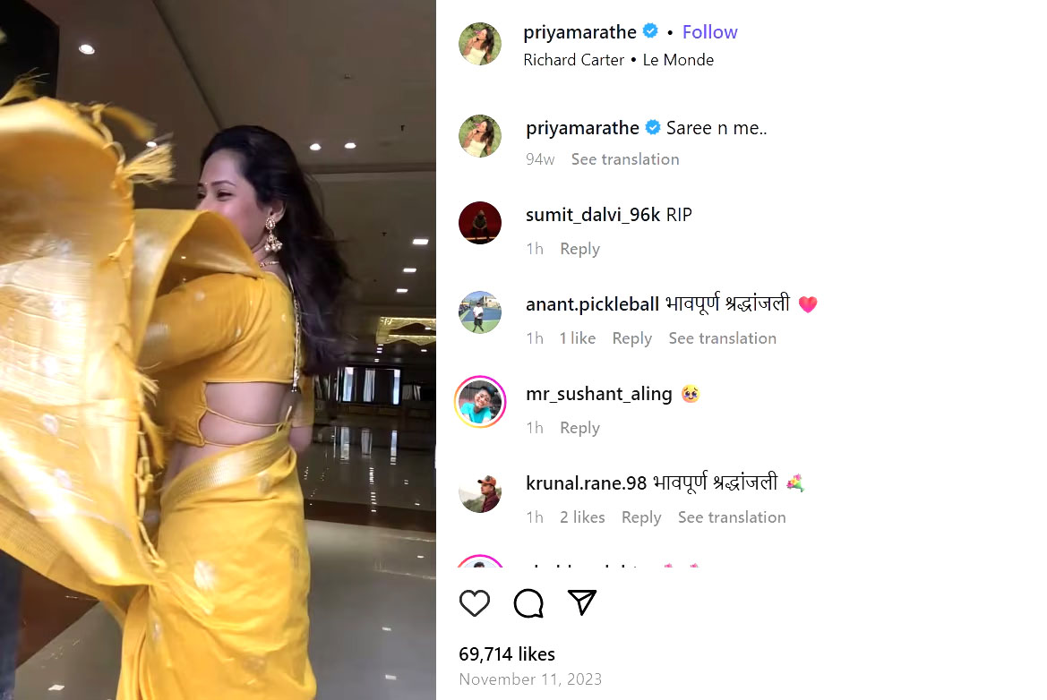 प्रिया ही कर्करोगाचं निदान होईपर्यंत सोशल मीडियावर प्रचंड सक्रीय होती. आपल्या इन्स्टाग्राम अकाऊंटवरुन ती अनेकदा आपल्या फोटोशूटमधील आणि भटकंतीचे फोटो तसेच व्हिडीओ पोस्ट करायची. मागील दीड वर्षांहून अधिक काळापासून प्रिया सोशल मीडियापासून दूर होती. प्रियाची तिच्या इन्स्टाग्रामवरील शेवटची पोस्ट ही 11 नोव्हेंबर 2023 ची आहे. या पोस्टमध्ये प्रियाने तिचं साड्यांसंदर्भातील प्रेम व्यक्त केलं आहे. ”साडी आणि मी!” अशी कॅप्शन तिने या पोस्टला दिली आहे. या पोस्टमध्ये प्रिया तिच्या आवडत्या साड्या परिधान केल्याचं दिसून येत आहे. हा एक कोलाज केलेला व्हिडीओ आहे.