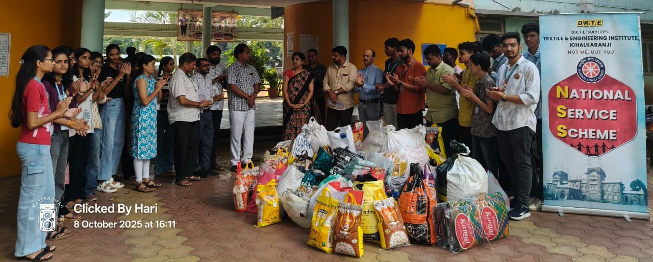 महाराष्ट्रातील मराठवाडा आणि सोलापूर जिल्हयामध्ये आलेल्या महापुरामुळे तेथील नागरिक हे चिंताग्रस्त झाले असून आपले पशूधन घेवून मिळेल त्या ठिकाणी आसरा घेतलेला आहे. सदर पूरकालावधीमध्ये आपल्या महाराष्ट्रातील नागरिकांना मदत करणे हे आदय कर्तव्य असुन त्यासाठी डीकेटीईच्या एनएसएस विभागाकडून पुरग्रस्तांसाठी मदतीचा हात देण्याची विनंती करण्यात आली आणि त्याला भरभरुन प्रतिसाद देखील प्राप्त झाला एका दिवसातच विद्यार्थ्यांनी जीवनाआवश्यक वस्तूंचे संकलन केले व हया सर्व वस्तू इचलकंरजीचे मदत संकलन केंद्र सेंटर नाईट कॉलेज यथे असल्याने तेथे पोहच करण्यात आली. त्या जीवनाअवश्यक वस्तू हया सोलापूर व मराठवाडयामधील सर्व पूरग्रस्त नागरिकांना देण्यात येणार आहेत.