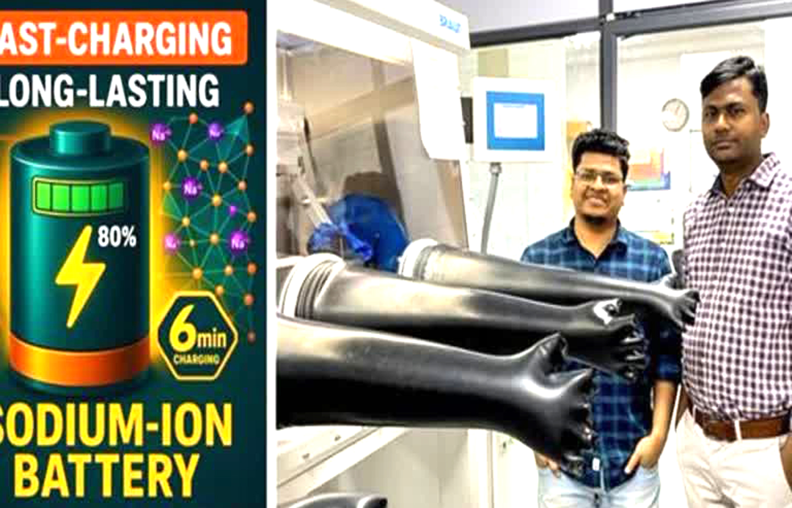 जवाहरलाल नेहरू सेंटर फॉर ॲडव्हान्स्ड सायंटिफिक रिसर्च (गछउअडठ), तंत्रज्ञान विभागाच्या स्वायत्त संस्थेतील संशोधकांनी सुपर-फास्ट चार्जिंग सोडियम आयन बॅटरी (डखइ) विकसित केली आहे. ही बॅटरी लिथियमऐवजी सोडियमवर आधारित असून, भारत सरकारच्या आत्मनिर्भर भारत अभियानाला चालना देणारी आहे. ही बॅटरी केवळ सहा मिनिटांत 80 टक्के चार्ज होऊ शकते. या संशोधनामुळं ऊर्जा साठवण तंत्रज्ञानात भारत स्वावलंबी होण्याच्या दिशेनं मोठे पाऊल टाकत आहे.